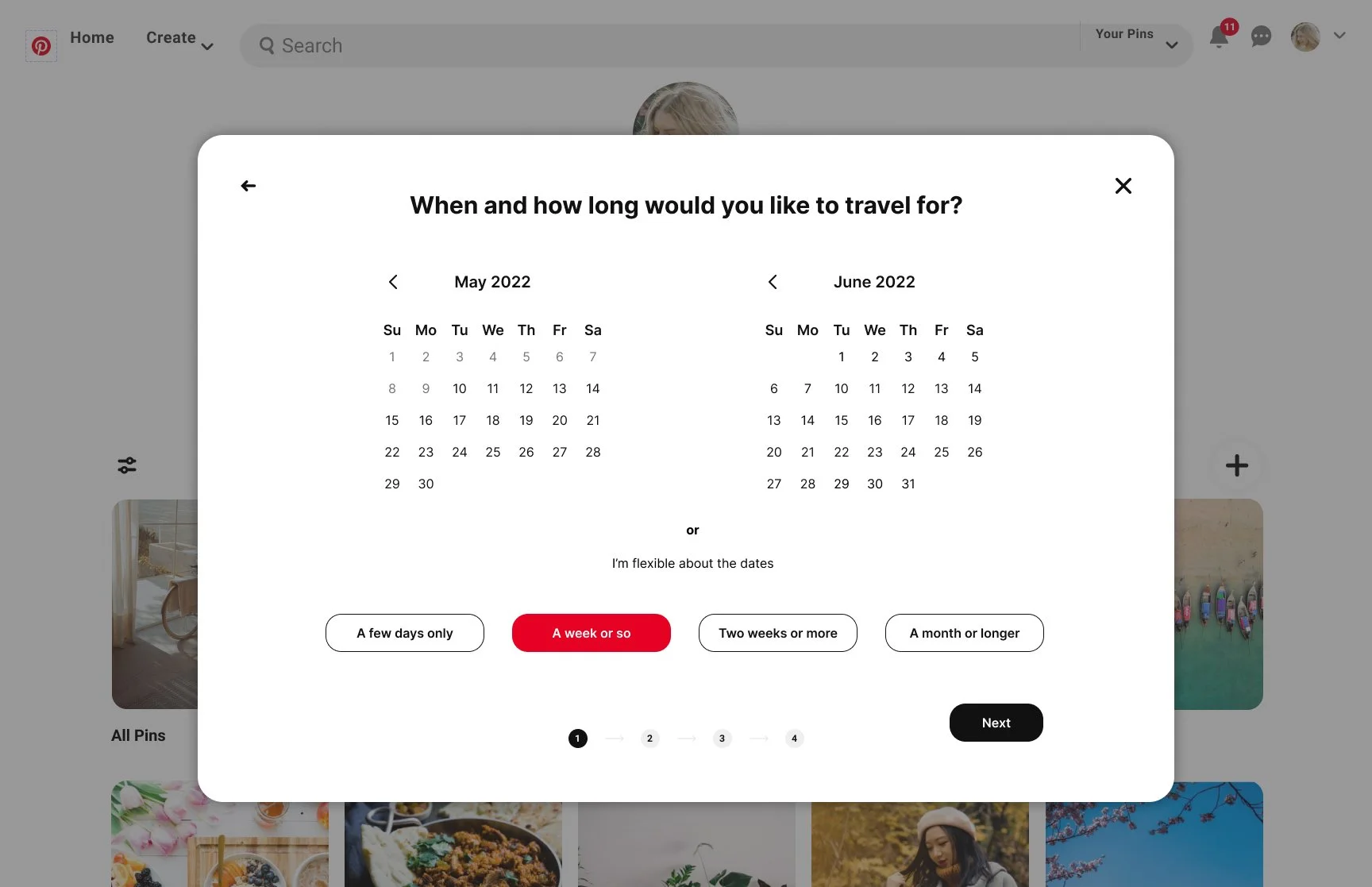 To help Ellie and other users get from inspiration to reality, I propose to use Pinterest’s powerful AI to generate an itinerary based on their preferences. It would propose an itinerary according to one’s answers to a few questions. I created the user flow from the User’s Profile Feed page to getting the itinerary created.